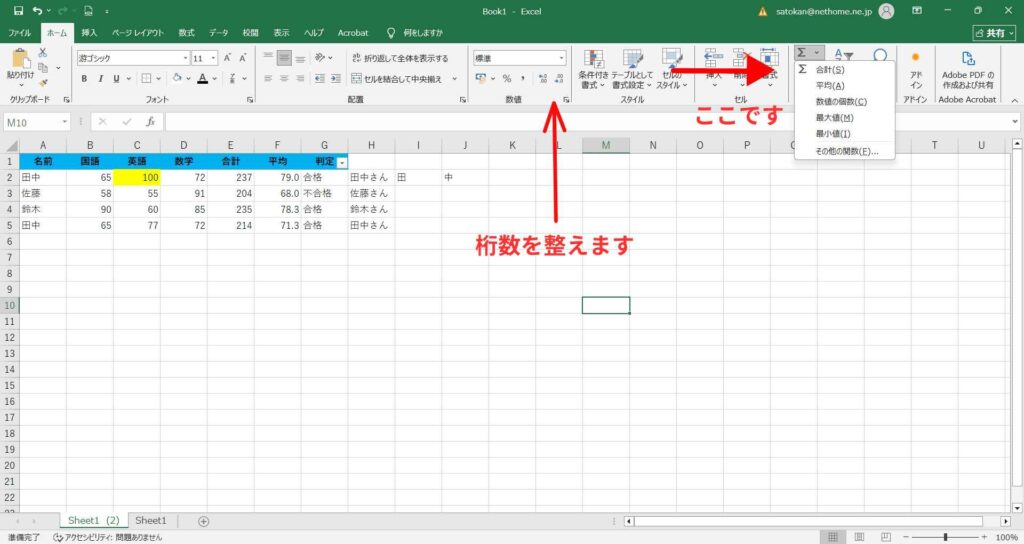 平均はオートサムの「平均」ボタンを押すだけでOK。=AVERAGE(B2:D2)が自動で入るので、数式を打たなくても大丈夫。